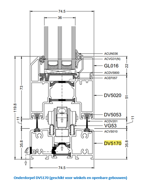 - Isolatiewaarde Uw 1.3 W/m²K (afm. 3500mm x 2500mm; UG: 1.0W/m²K & PSI: 0.036W/mK - profil DV5010-DV5020(DVi)