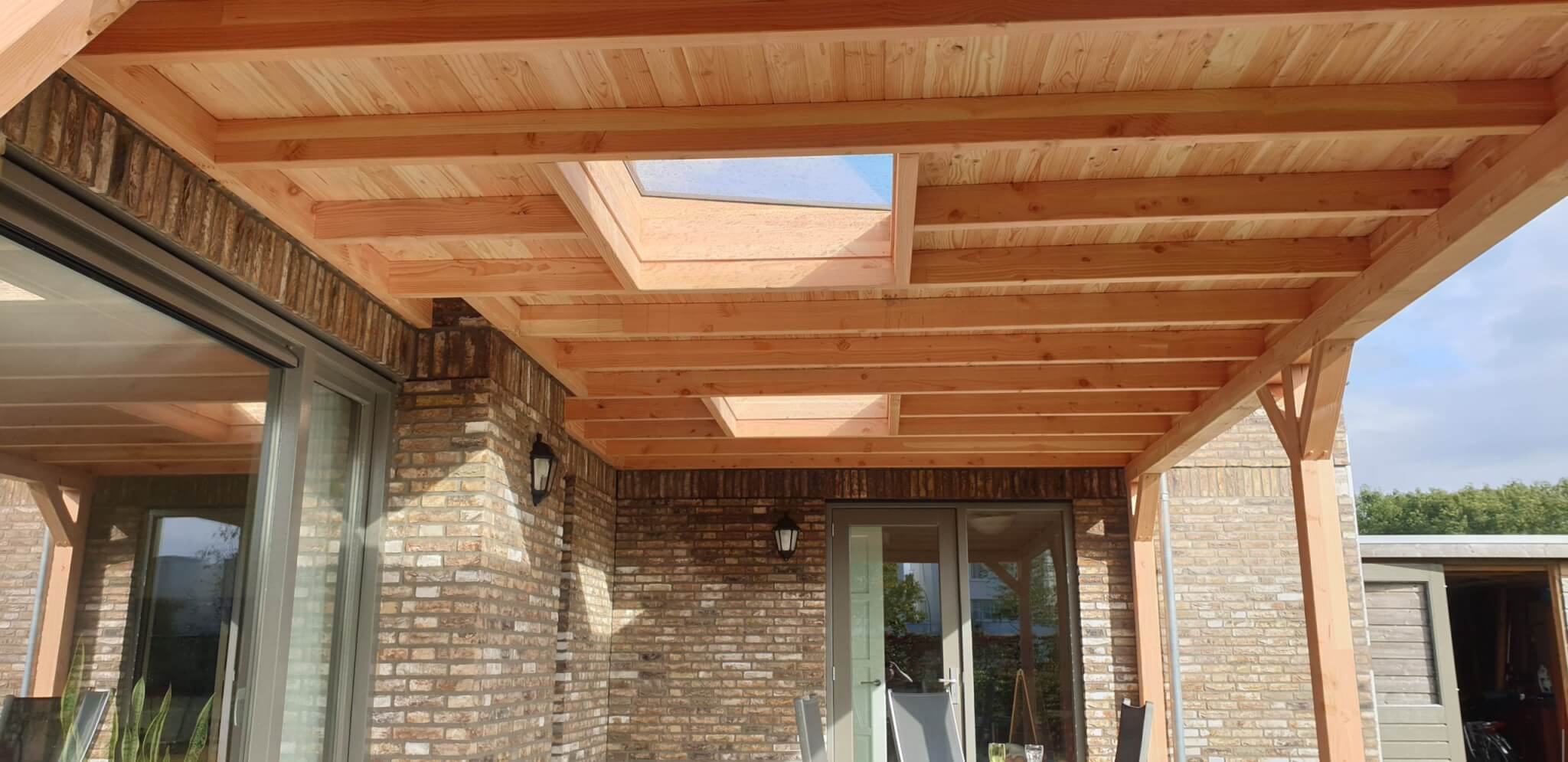 - Douglas houten onderconstructie: opstandbalk, liggers en nokbalk.