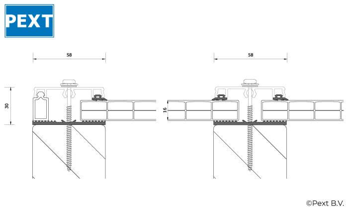 Een daksysteem van Pext is bedoelt voor montage op een houten onderconstructie. Hierbij adviseren we i.v.m. de opleg minimaal balkhout van 60 mm breed toe te passen. Het pakket wordt geleverd met Polycarbonaatplaten van 980 mm of 1050 mm breed, waardoor vele standaard maten beschikbaar zijn, daarnaast is het mogelijk om elk pakket op maat te bestellen. Hierbij worden alle platen en profielen evenredig op breedte gemaakt.