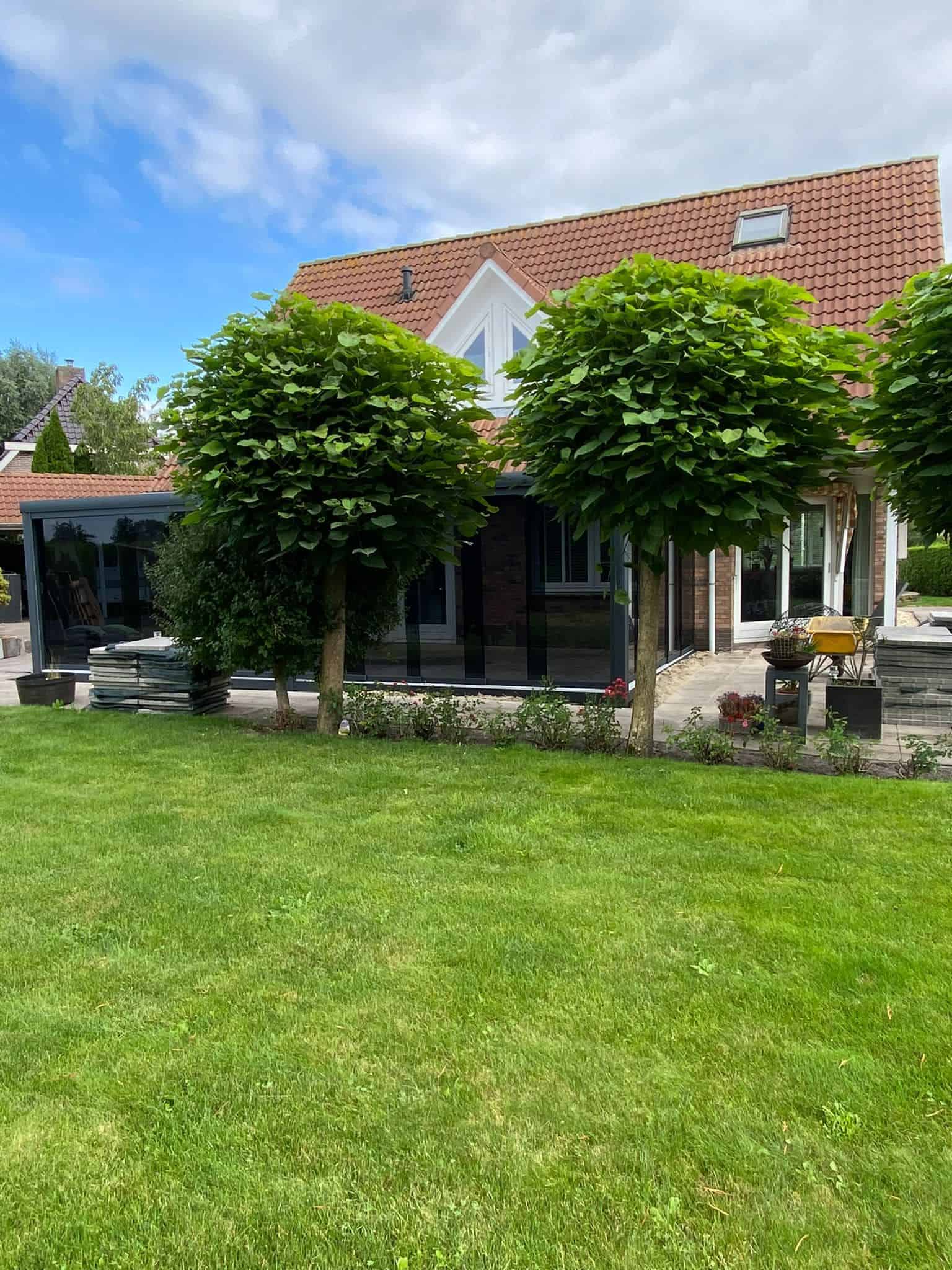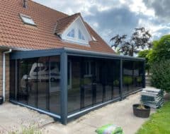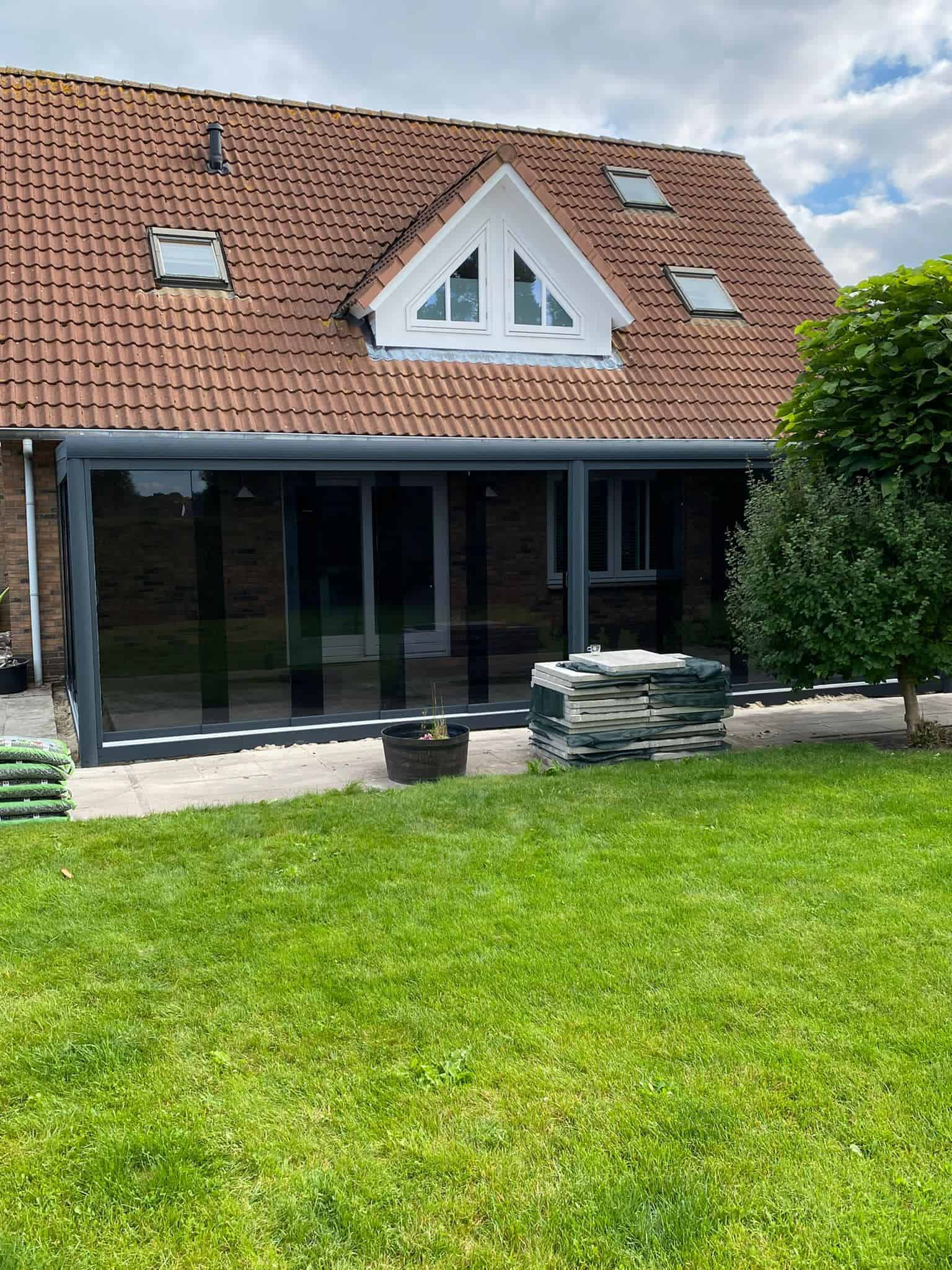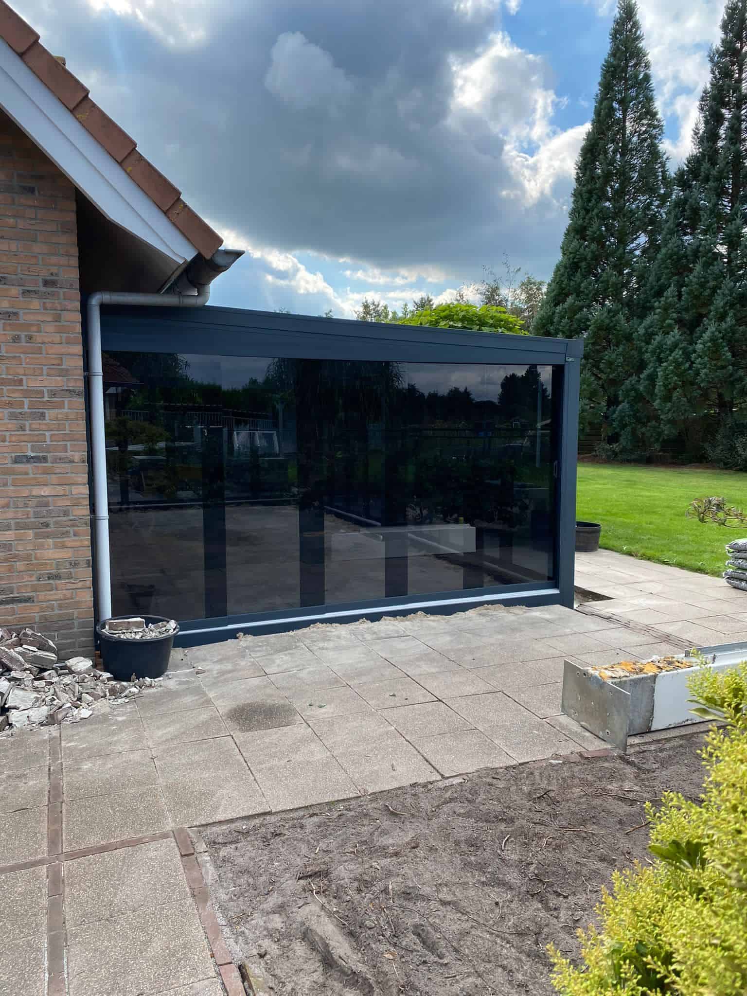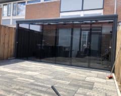 De glazen schuifwand is inclusief tochtstrippen, boven- en onderrail, U-profielen, en een RVS handgreep.