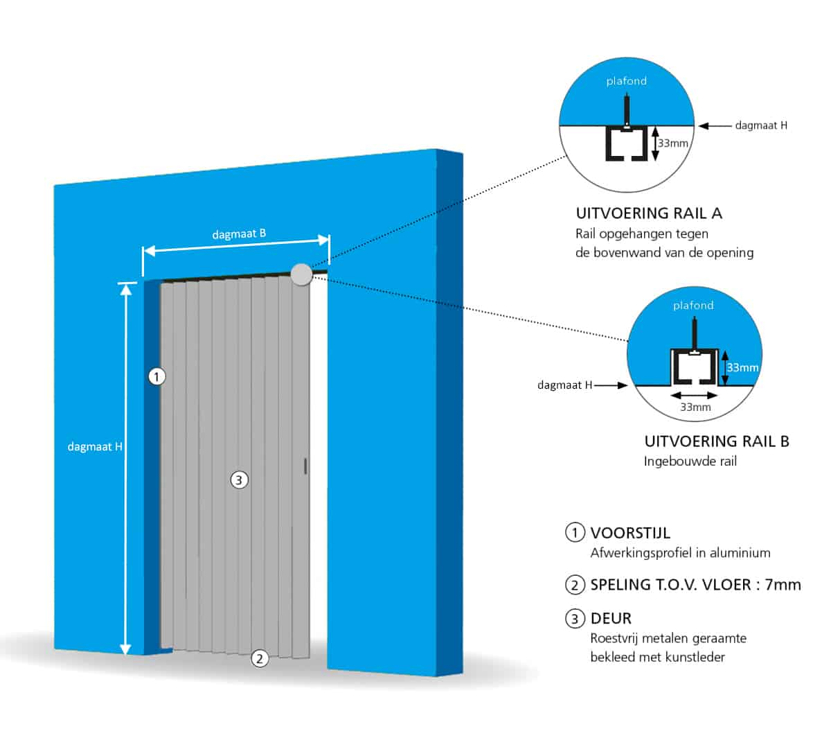 U kunt kiezen tussen een sleepboord boven of een sleepboord onder. Sleepboord is een extra stukje kunstleder van ongeveer 7 mm dat ervoor zorgt dat uw kunstleren vouwwand is afgedicht tot de grond (onder) of tot het plafond (boven). Een sleepboord boven is enkel mogelijk bij railuitvoering B (rail ingebouwd in het plafond).