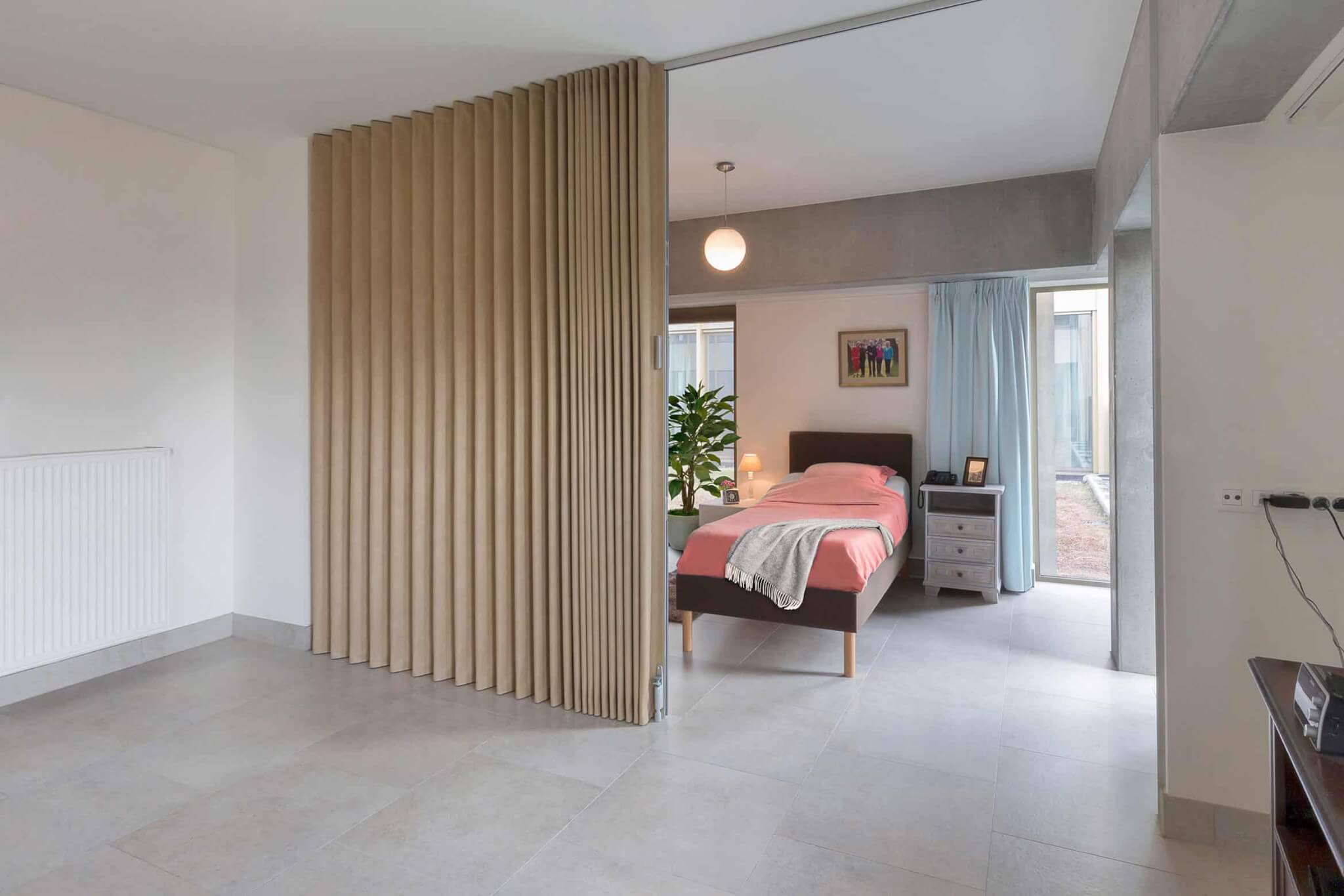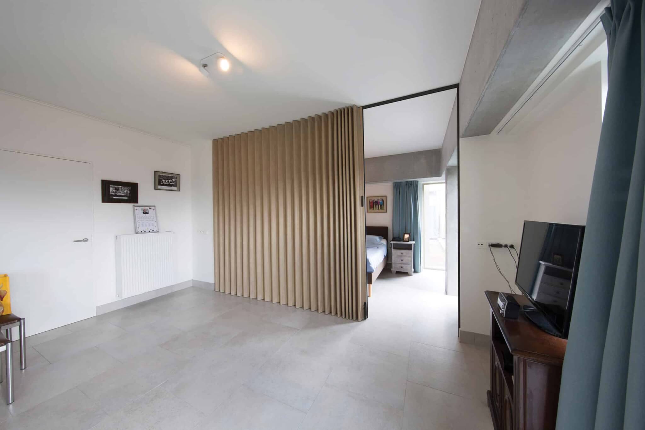 U kunt kiezen tussen een sleepboord boven of een sleepboord onder. Sleepboord is een extra stukje kunstleder van ongeveer 7 mm dat ervoor zorgt dat uw kunstleren vouwwand is afgedicht tot de grond (onder) of tot het plafond (boven). Een sleepboord boven is enkel mogelijk bij railuitvoering B (rail ingebouwd in het plafond).