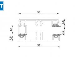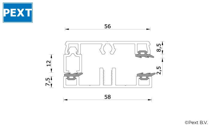 – Zijsluitprofiel, aluminium of brut, schroefbaar met beglazingsrubber en vullat, 58 mm breed
