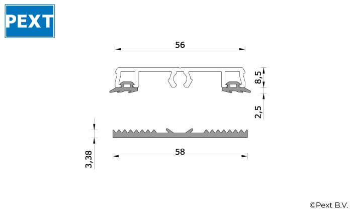 Het EPDM rubber van Pext is 58 mm breed en 3 mm dik. Zorg voor een juiste opleg en ondergrond, zodat de oplegrubber met gebruik van kit of nietjes netjes op de onderconstructie vast gemaakt kan worden. Het afdekprofiel met beglazingsrubbers is geschikt voor alle types beglazing.