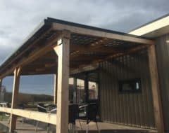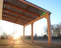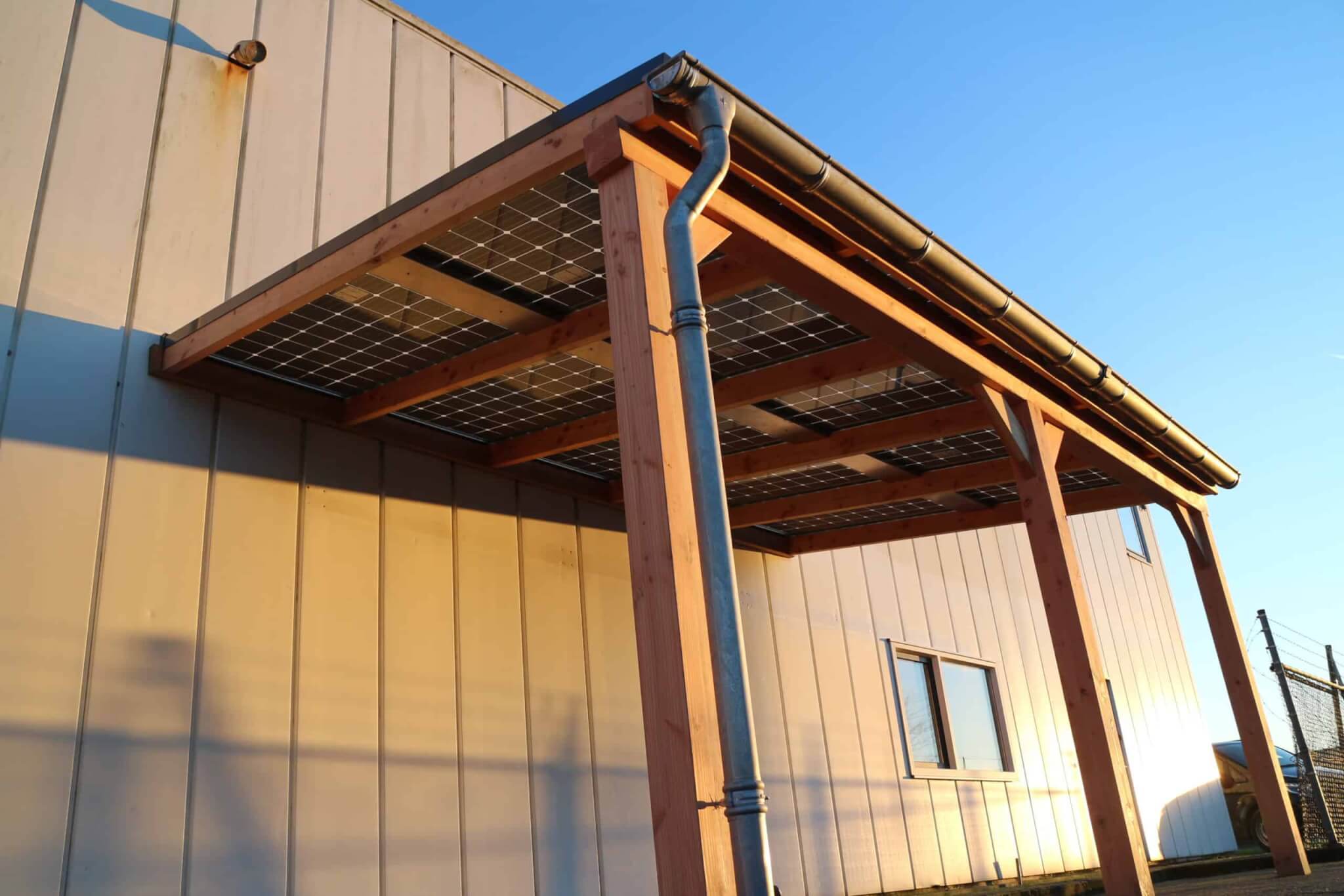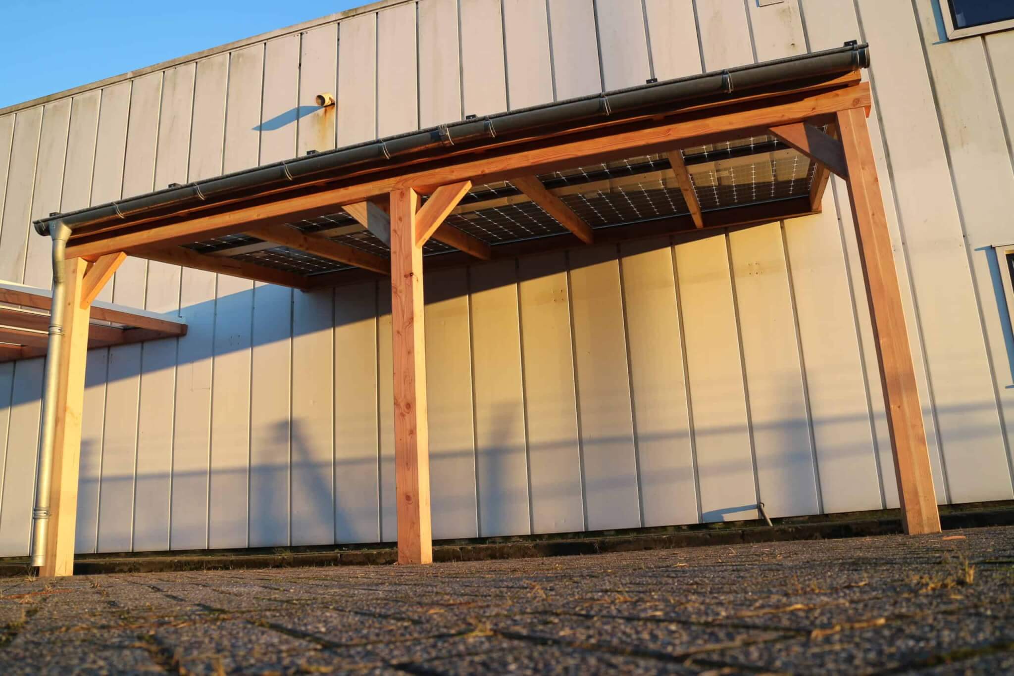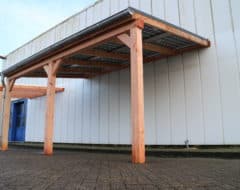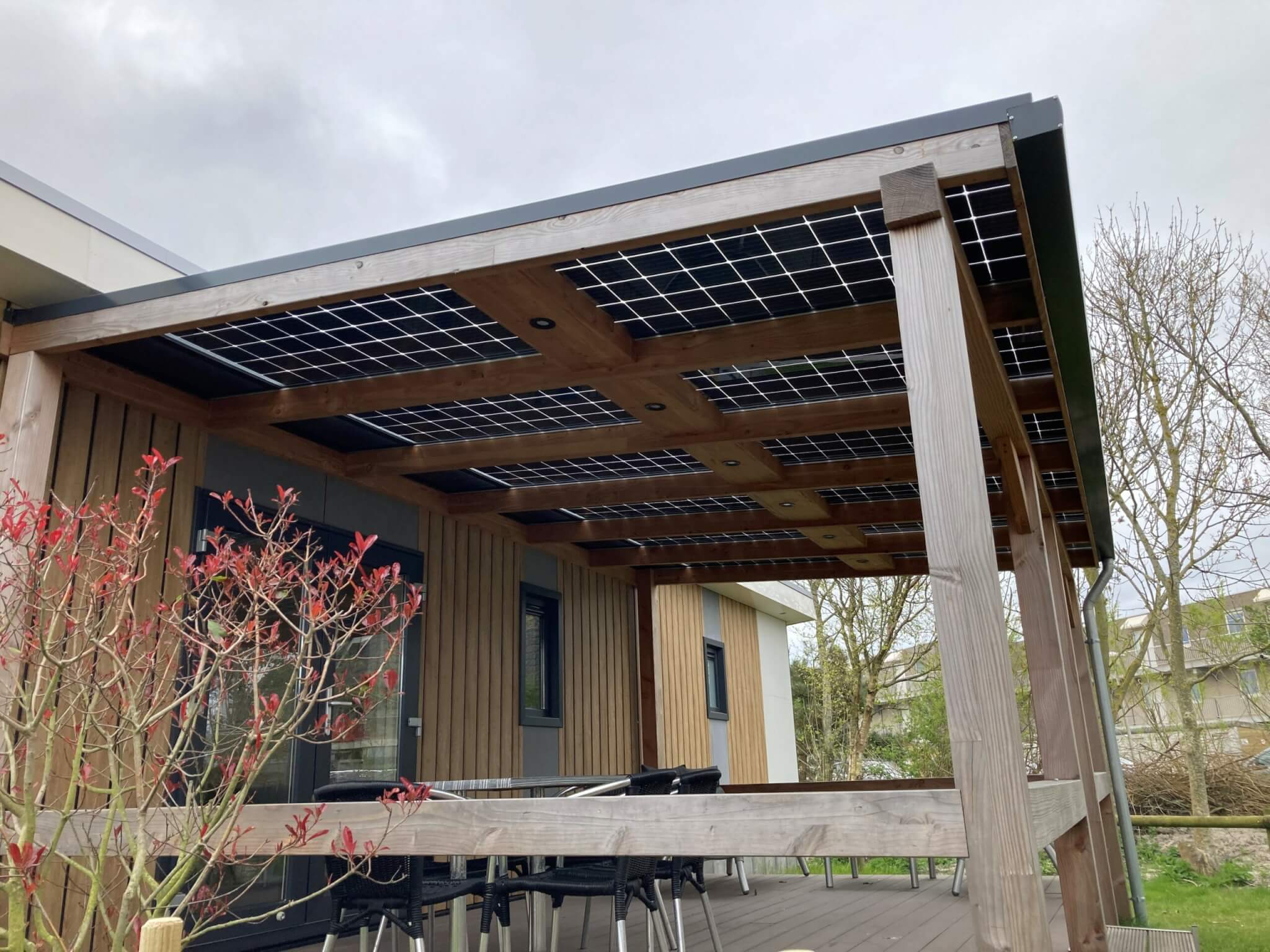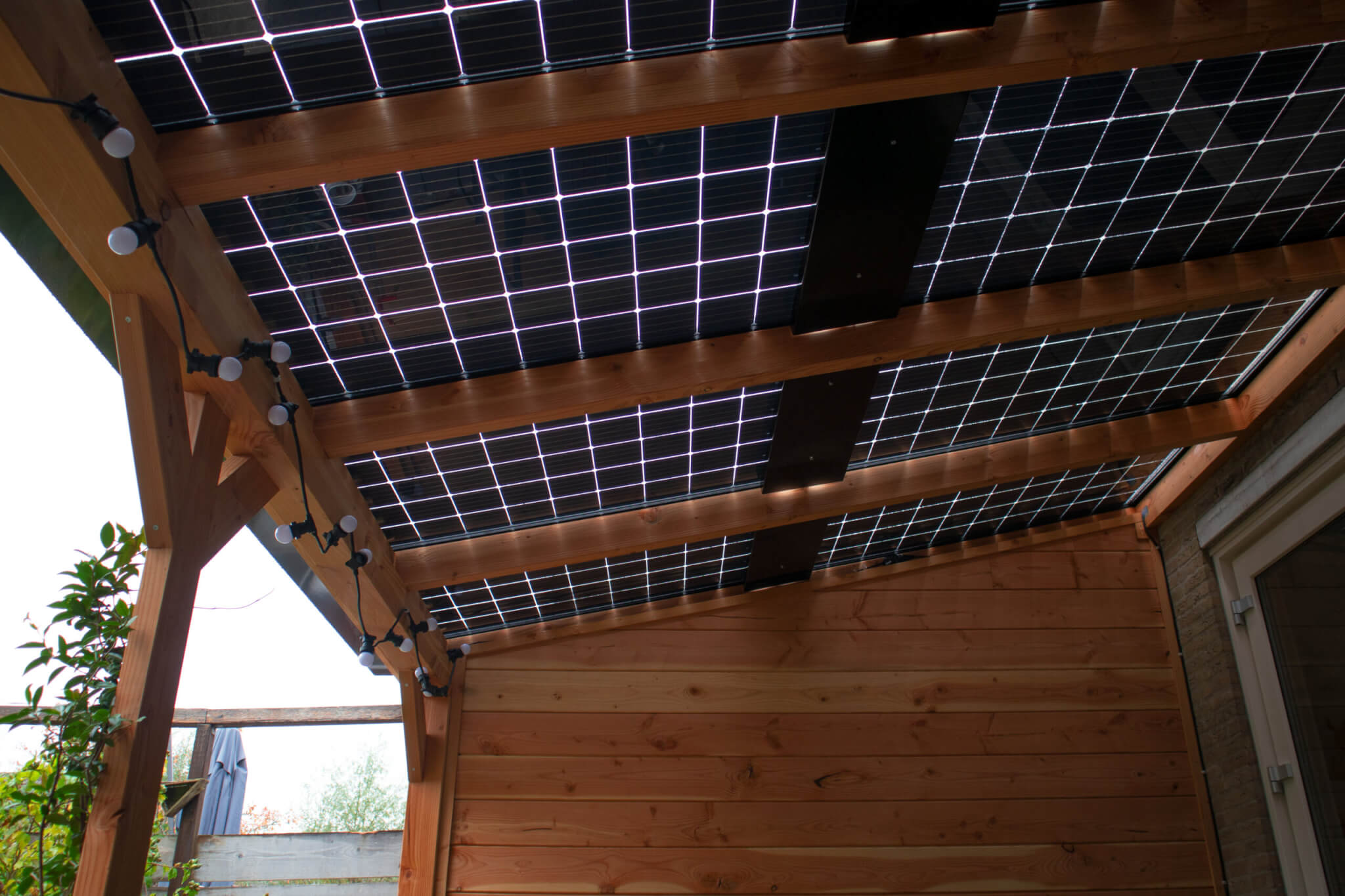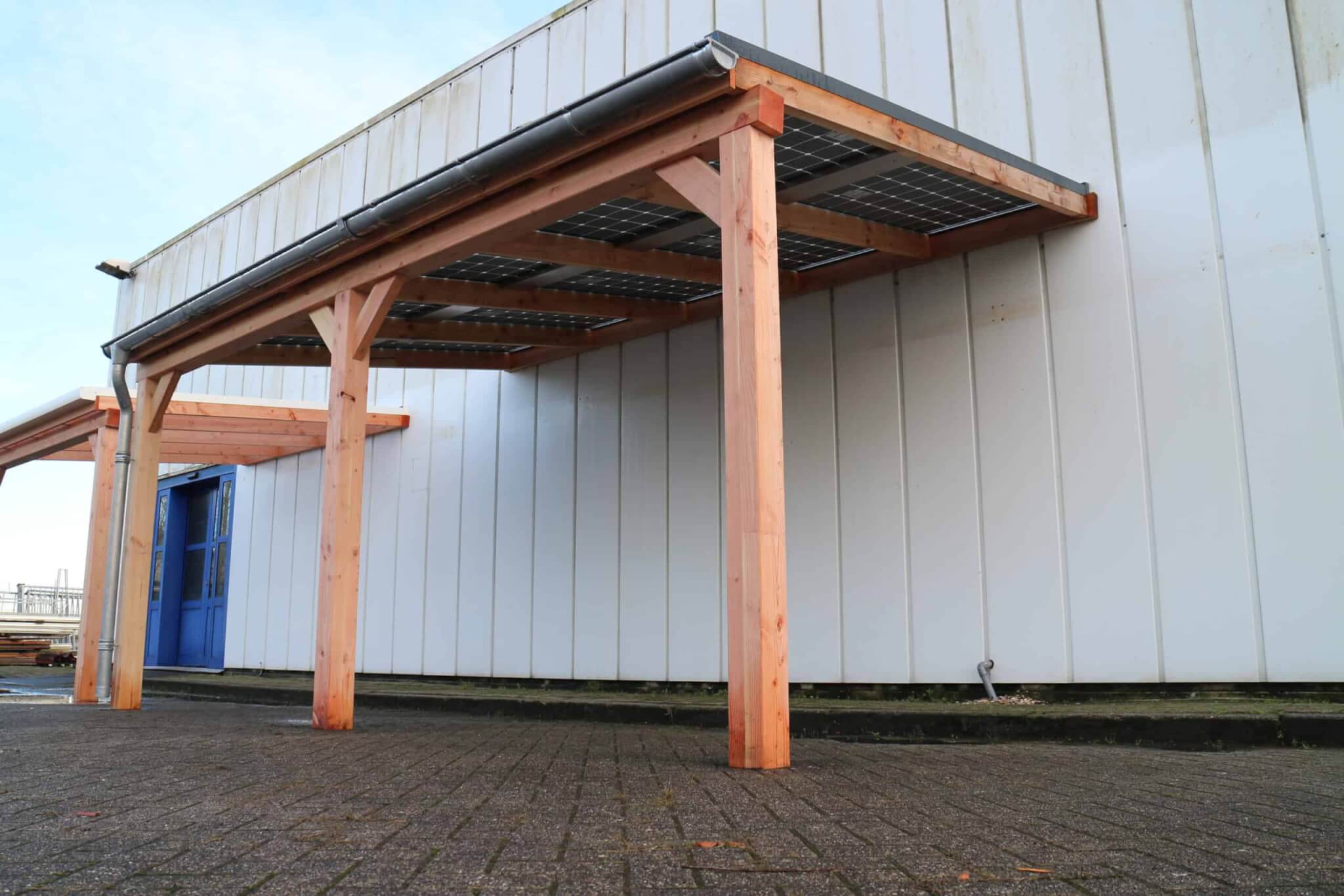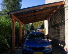 Een duurzame E-Veranda of E-Carport vrijstaand met staanders en dwarsligger van 14 cm en liggers van 6×14 cm, een professioneel aluminium schroefprofielsysteem met sier-kliklijsten in de kleur zwart (RAL9005), wit (RAL9010) of antraciet (RAL7016), en glas-glas PV-panelen van Solid Bi-Facial als beglazing. De constructie is gemaakt van Duplo verlijmd Douglashout; dit is een geoptimaliseerde soort balkhout, waarbij 2 balken worden gevingerlast en op elkaar verlijmd tot een solide balk, waarna deze wordt geschaafd en gekant voor een gladde afwerking. Hierdoor ontstaat een balk met homegenere structuur.