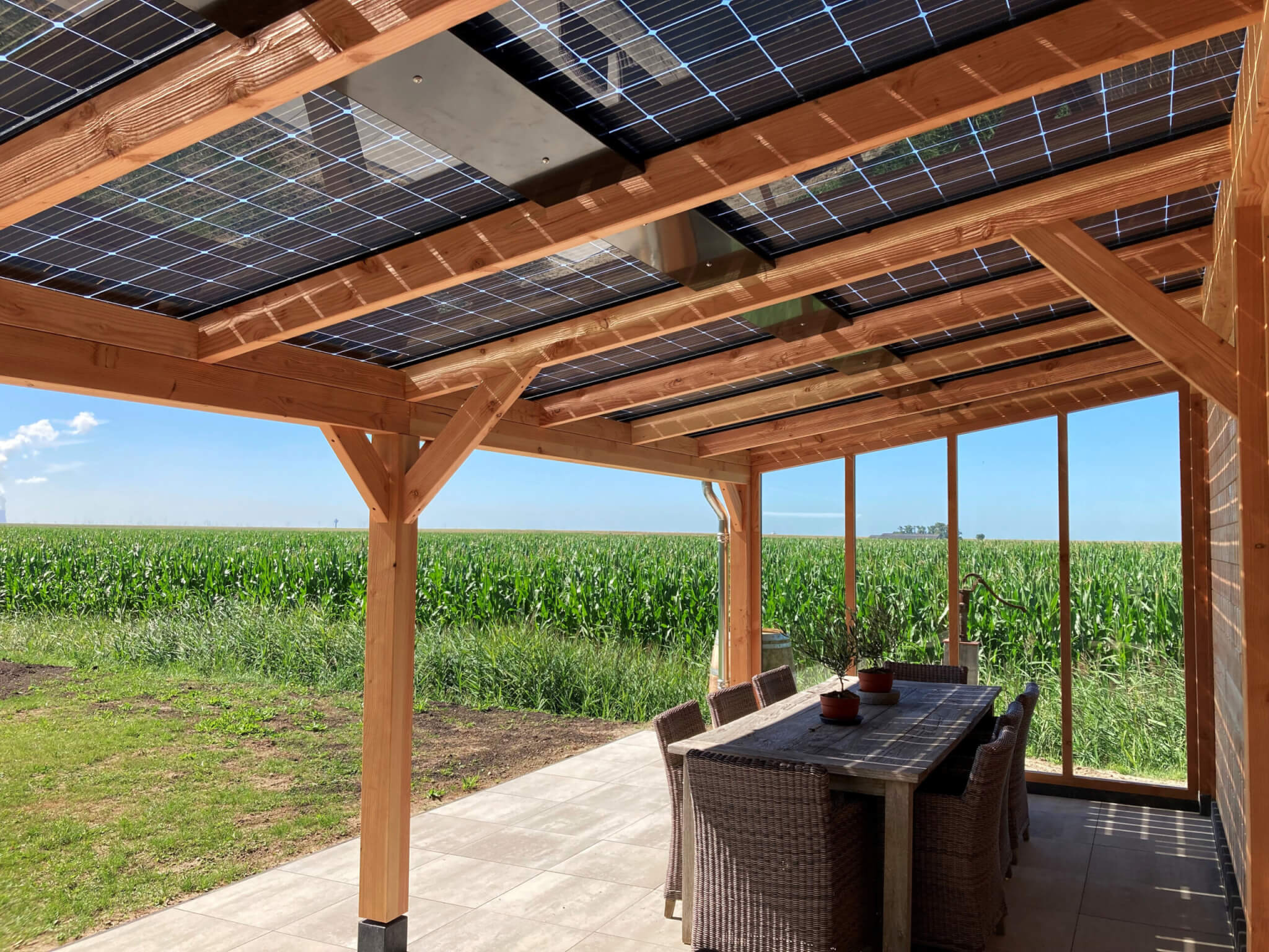 Door de efficiëntie van de dubbelzijdige zonnecellen kan het daadwerkelijke vermogen van maar liefst 370 Wp per paneel. Het dak van de solar veranda staat onder een hoek van 10 graden. Hierdoor valt het zonlicht langer over de dag op de zonnecellen en is de gemiddelde opbrengst zeer hoog.