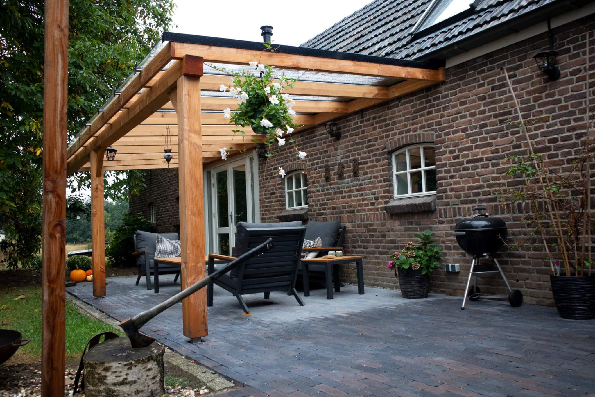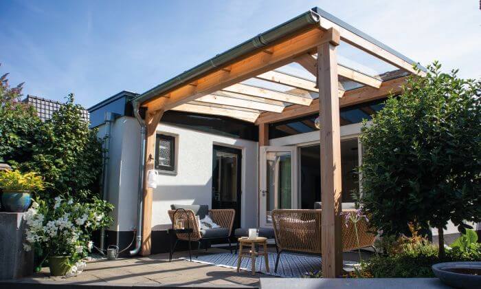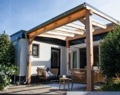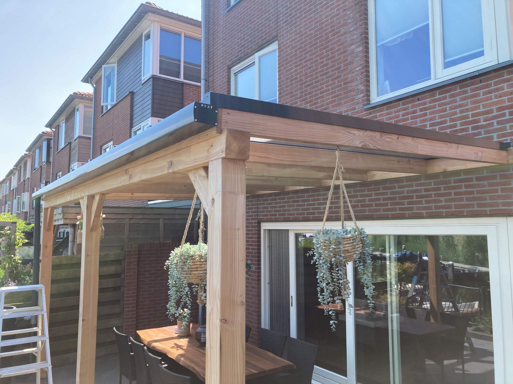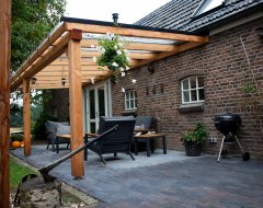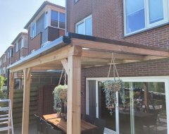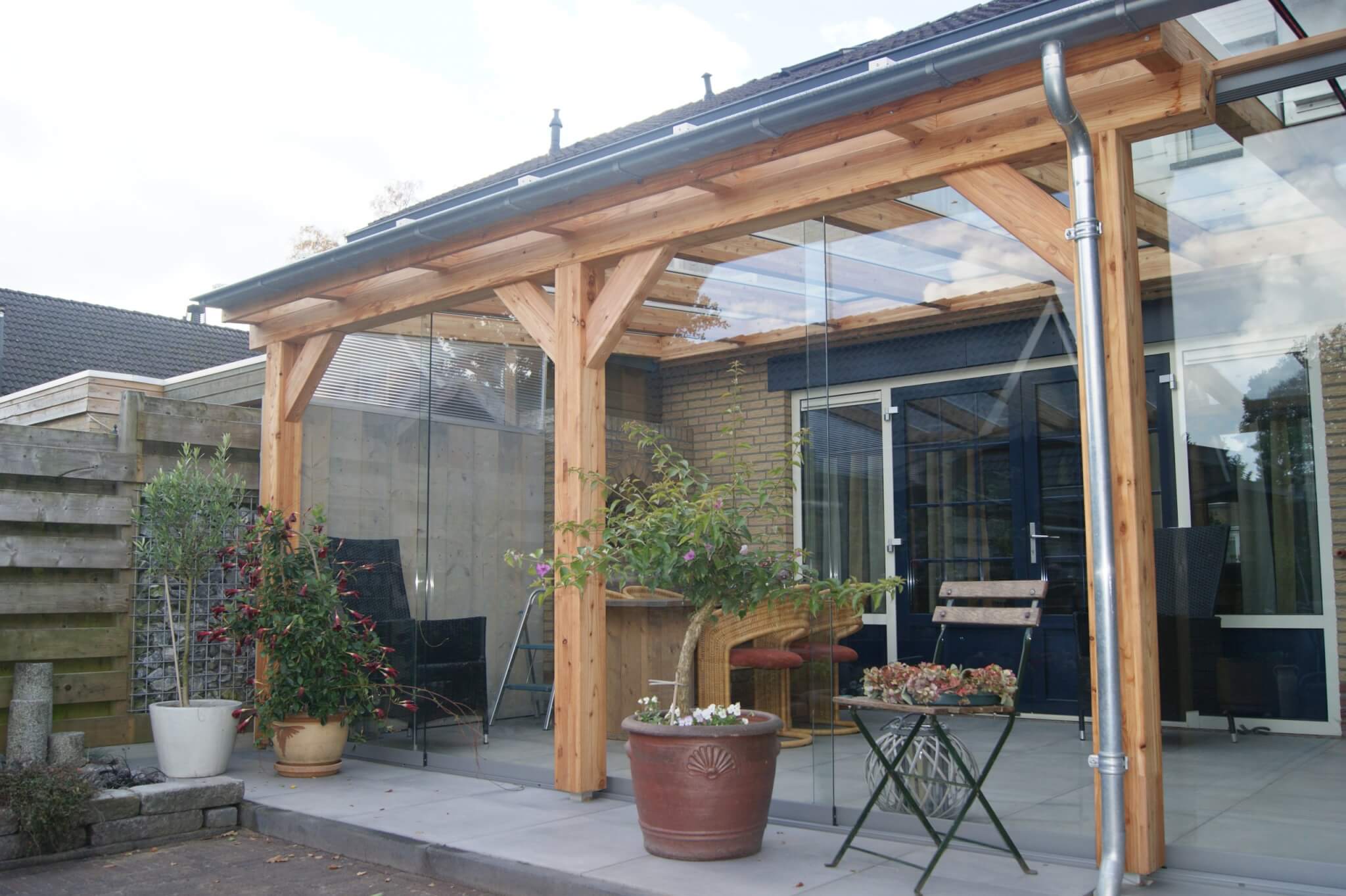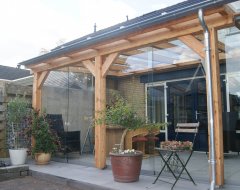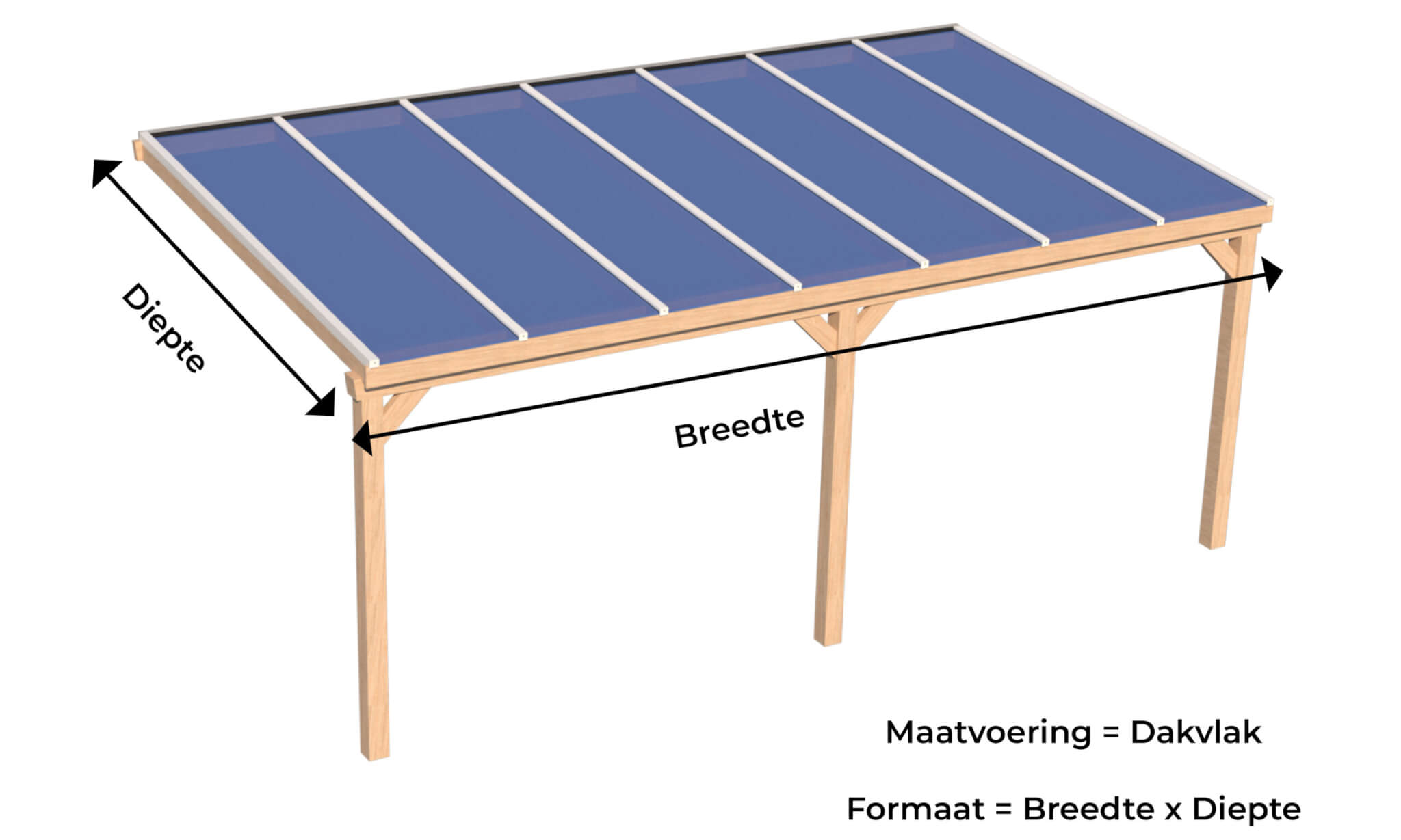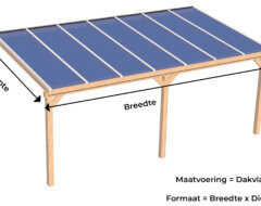 Een compleet bouwpakket van Douglas Duplo balkhout voor het maken van een veranda, overkapping of carport. Het gehele pakket wordt kant en klaar geleverd en voorzien van alle inkepingen. De veranda kan in vele standaard maatvoeringen worden geleverd. Daarnaast is het ook mogelijk om elke gewenste maatvoering op te geven. Hierbij worden alle platen evenredig verdeeld. Een pakket bestaat uit: