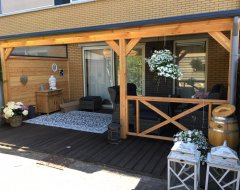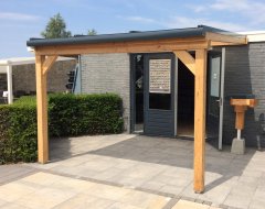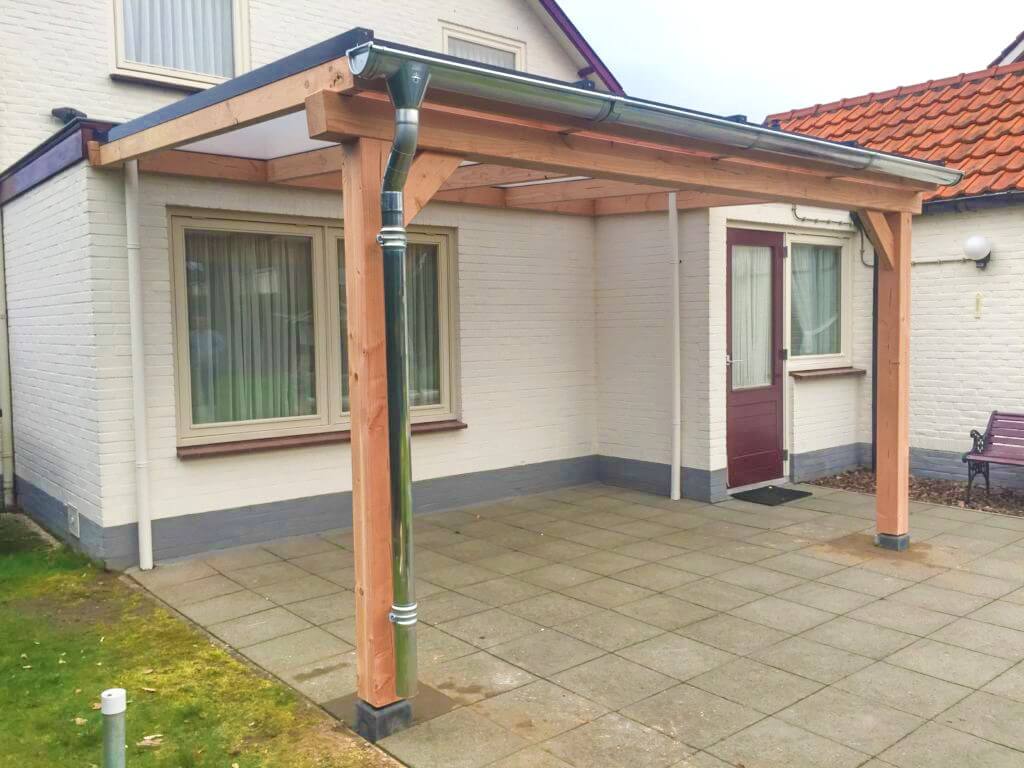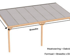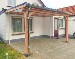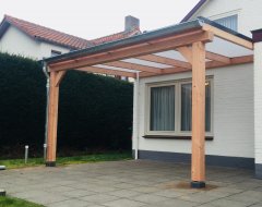 Een compleet bouwpakket van Douglas Duplo balkhout voor het maken van een muuraanbouw veranda, overkapping of carport. Het gehele pakket wordt kant en klaar geleverd en voorzien van alle inkepingen. De veranda kan in vele standaard maatvoeringen worden geleverd. Daarnaast is het ook mogelijk om elke gewenste maatvoering op te geven. Hierbij worden alle platen evenredig verdeeld. Er wordt gebruikt gedroogd Duplo verlijmd geschaafd Douglas balkhout gebruikt. De voordelen van het verlijmen van staanders en gordingen zijn: minder kromtrekken, minder kans op scheurvormingen, nog sterker en duurzamer dan massief gezaagd.