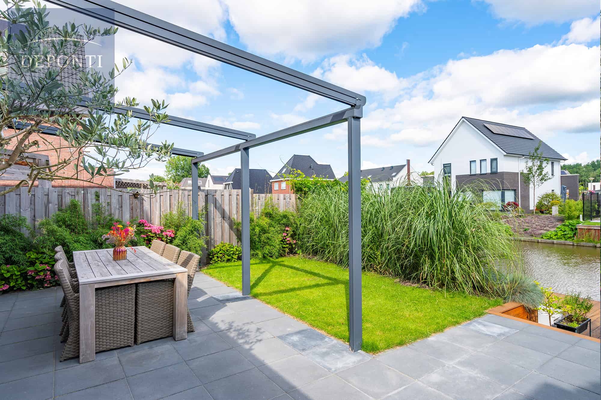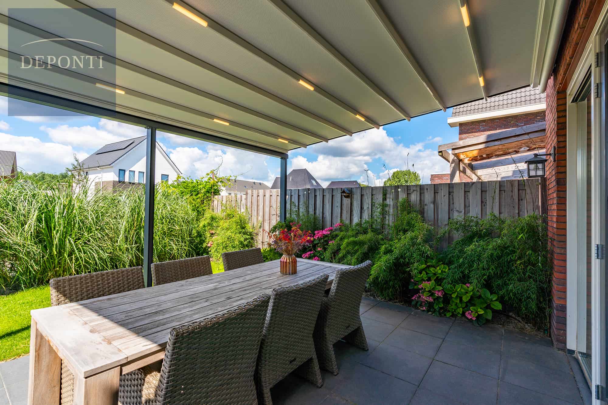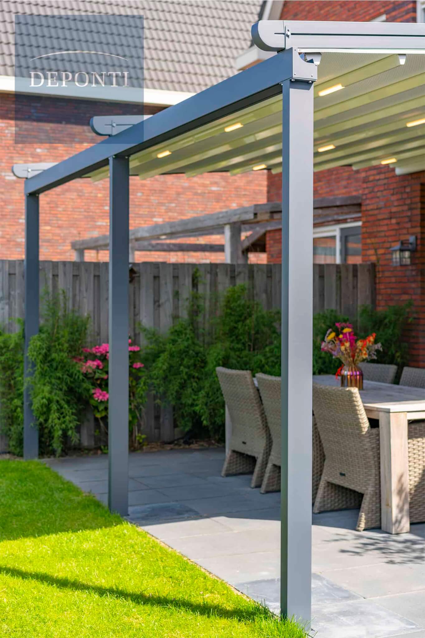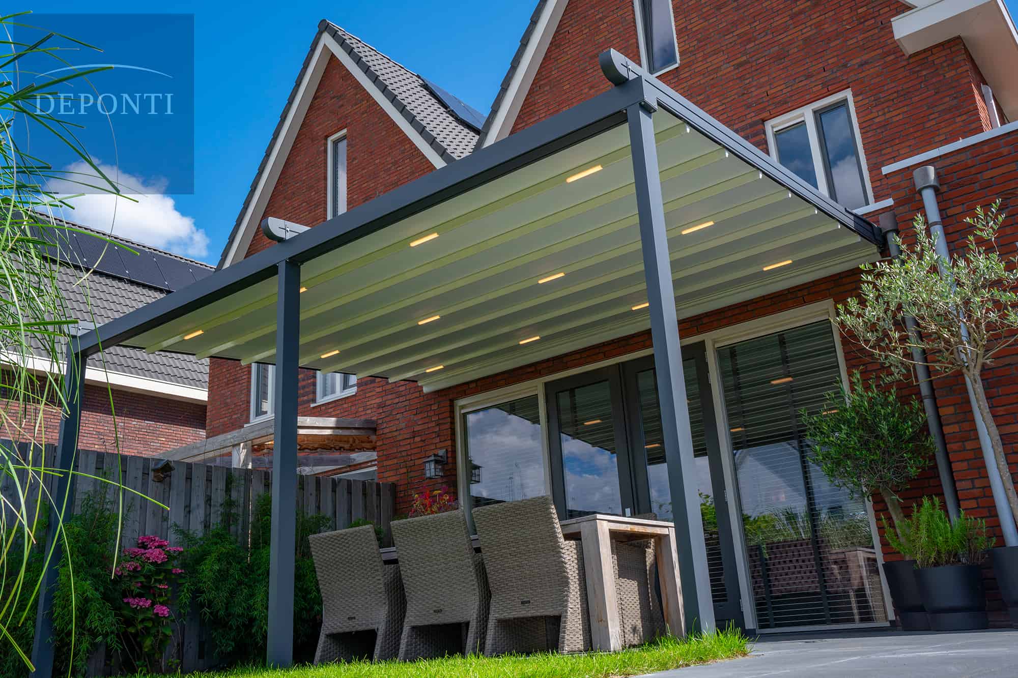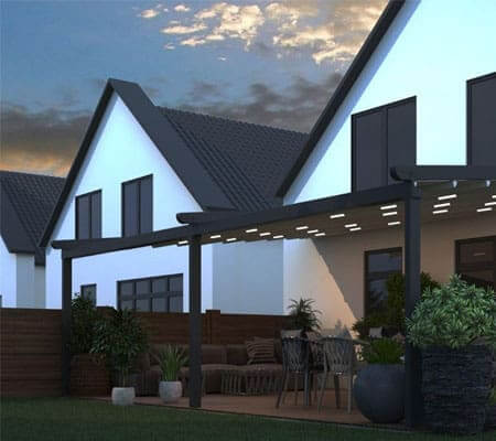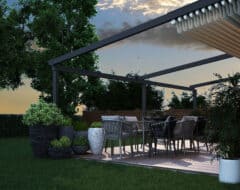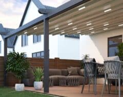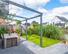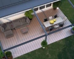 Wanneer u glazen schuifwanden toevoegt, tovert u deze overkapping om in een complete tuinkamer. Optimaal comfort op uw terras dankzij de flexibiliteit van de Verdeca terrasoverkapping.