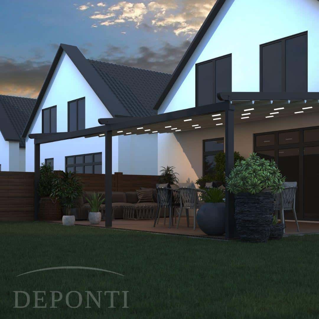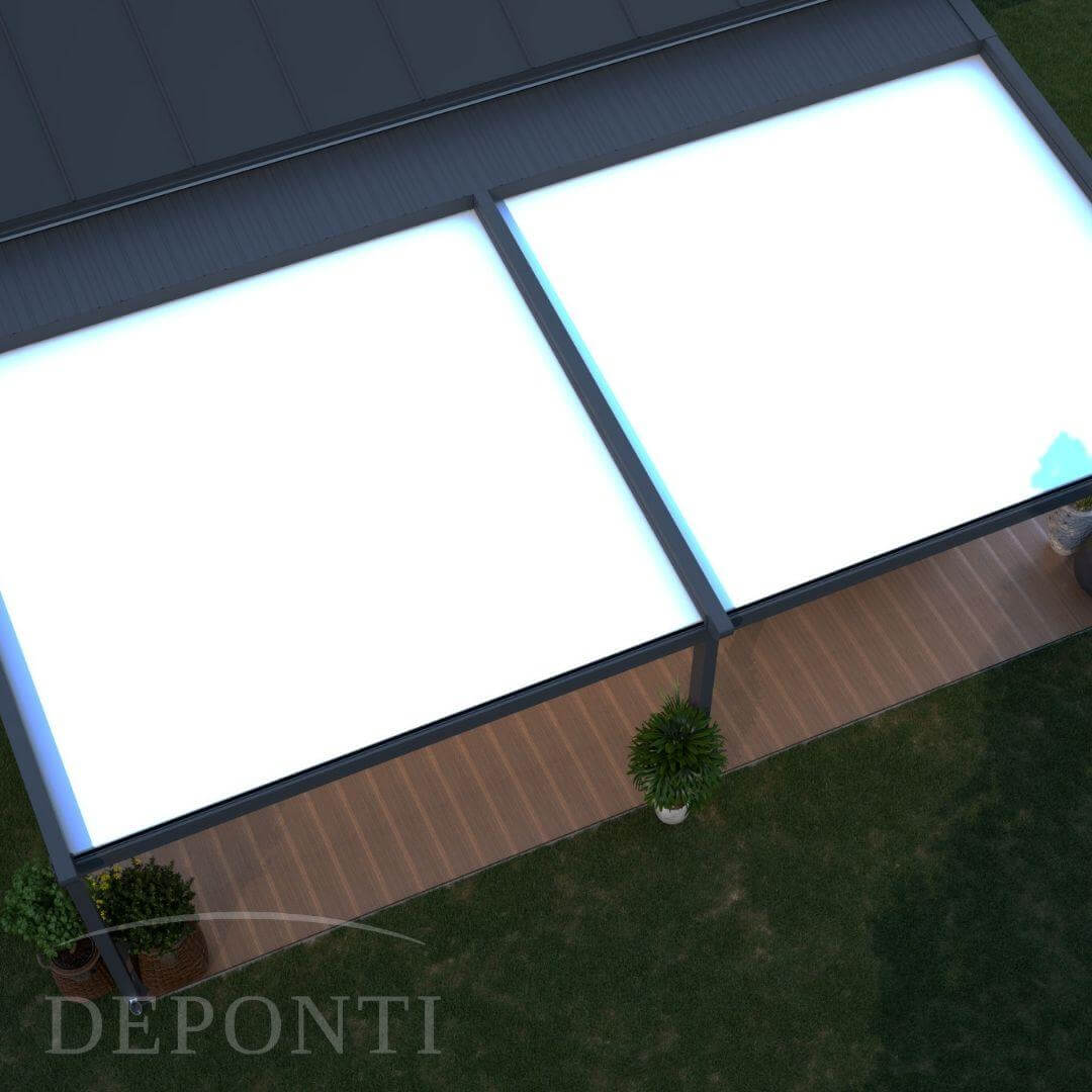 De Verdeca terrasoverkapping kenmerkt zich door een aluminium frame RAL 7024 en een wit waterafstotend doek. De constructie biedt optimale stevigheid en windbestendigheid. De overkapping biedt perfect zicht. Dit komt doordat de roestvrijstalen verbindingselementen en schroeven (onzichtbaar) zijn weggewerkt. De regengoot is bovendien voorzien van een anti-tocht systeem. Dit systeem voorkomt dat er wind tussen het plafonddoek, de rails en de regengoot naar binnen dringt.