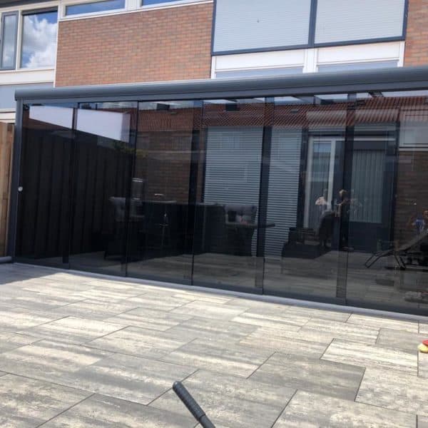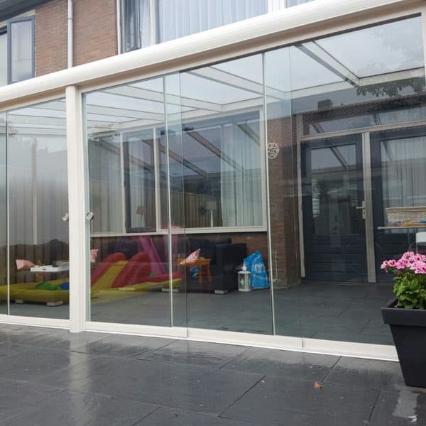 De glazen schuifwand is inclusief tochtstrippen, boven- en onderrail, U-profielen, en een RVS handgreep.