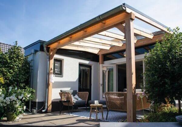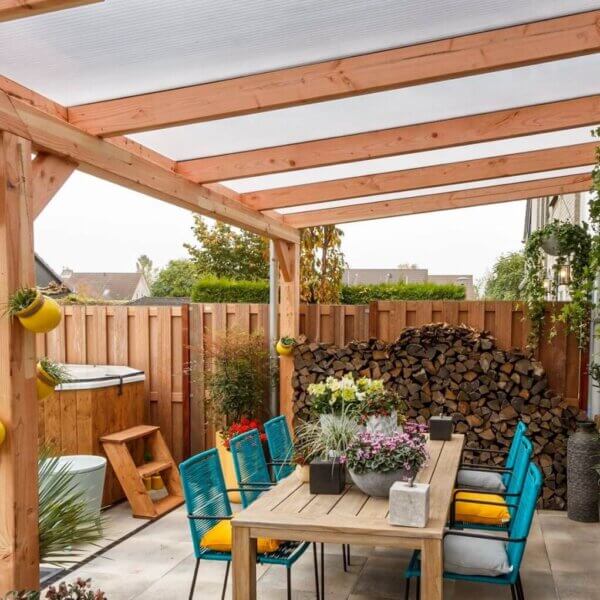 Wilt u graag een douglas houten veranda als aanbouw? Op deze manier creëert u een verlenging van uw huis. Wanneer u kiest voor een constructie met een schuin dak of plat dak, verliest u behoorlijk wat natuurlijk daglicht in huis. Om lichtinval te behouden, zou u dakramen of een lichtstraat kunnen plaatsen. Wij leveren een zelfbouwconstructie inclusief dakpakket met polycarbonaat platen. Met een polycarbonaat dak behoudt u het natuurlijk daglicht en geniet u tevens van de warmte van het zonnetje. Wat natuurlijk heerlijk is in het vroege voorjaar of in het najaar.