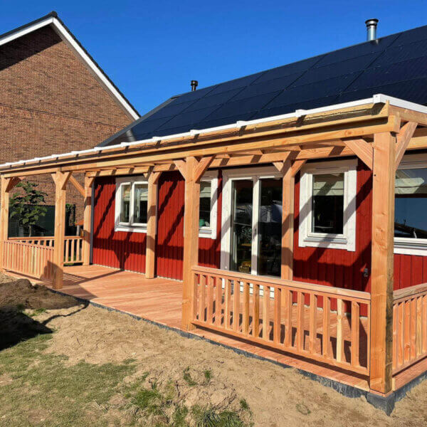 Een houten veranda heeft een luxe en natuurlijke uitstraling. Zeker veranda’s met een constructie van douglas hout. Als we het over een veranda hebben, dan wordt er oorspronkelijk een uitbouw van een woning bedoeld. Tegenwoordig wordt een veranda ook aan een schuur of een tuinhuis gebouwd. Maar er bestaan ook vrijstaande veranda’s. Een vrijstaande veranda dient vaak als overkapping van een terras. Ze vergroten ook het leefplezier en maken het mogelijk dat u nog langer kunt genieten van het buitenleven. Door een openhaard of terrasverwarming onder de overkapping te plaatsen, is het ook in het voorjaar en najaar heerlijk vertoeven in de tuin. Wilt u ook een zelf een houten veranda van douglas hout bouwen of er één laten plaatsen? Danenberg Shop levert complete veranda zelfbouwpakketten met de volgende onderdelen: