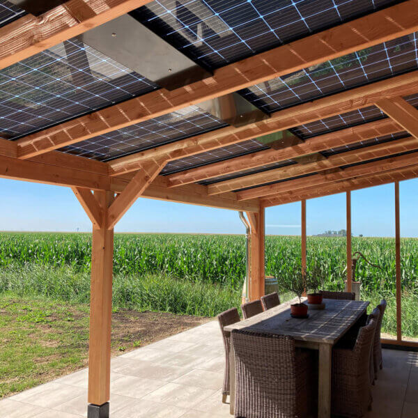 - Mooie uitstraling van robuust hout, aluminium en zonnepanelen licht doorlatend en waterdicht met 30 jaar garantie