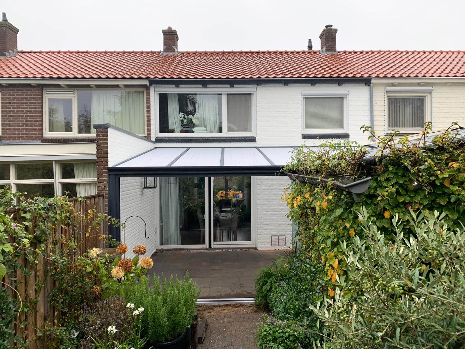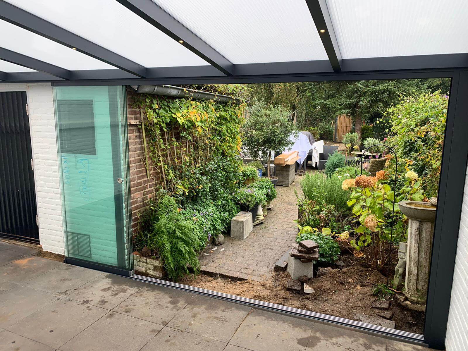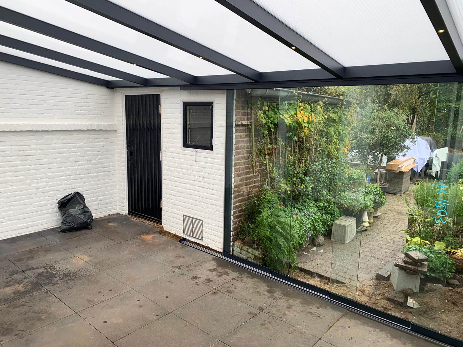 Fiano glaswanden gemonteerd in een nieuwe Giallo Terrasoverkapping. Deze overkapping is op maat gemaakt om tussen de 4 muren te passen.